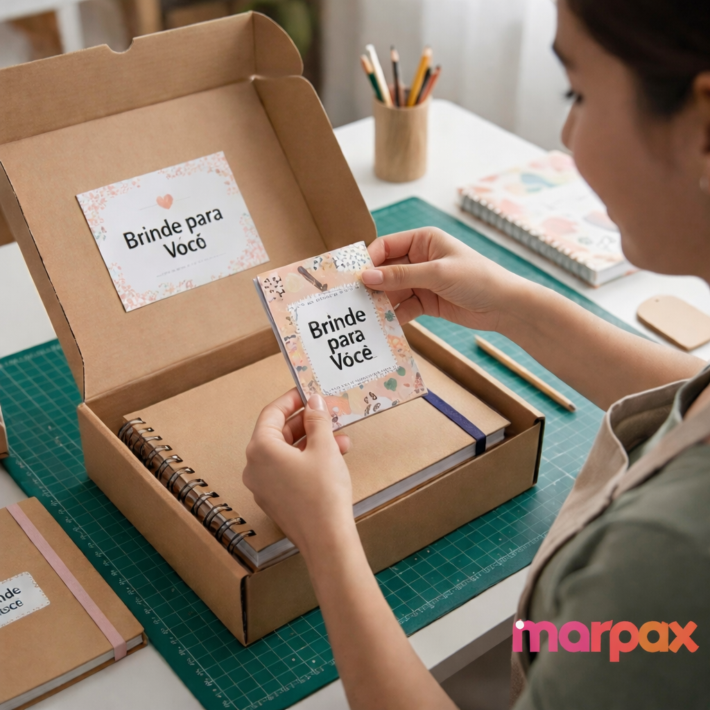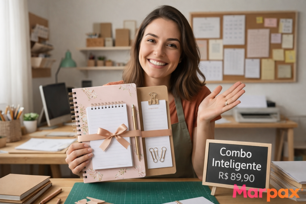 A lógica do combo é simples: o cliente leva mais itens por um preço melhor do que se comprasse tudo separado. Mas, em vez de pensar como papelaria tradicional, pense como artesã que vende produtos autorais.