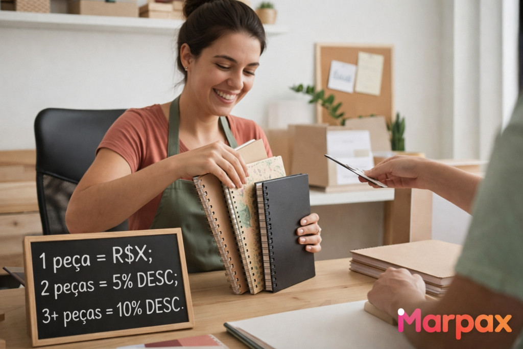 O desconto progressivo é perfeito para incentivar compras maiores, principalmente se você vende produtos que as pessoas costumam usar em quantidade (cadernos, bloquinhos, planners de presente, etc.).